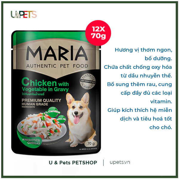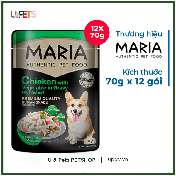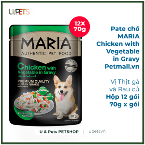 - Tên Sản Phẩm: Thức Ăn Mềm Cho Chó MARIA Chicken with Vegetable in Gravy – 70g/gói, Hộp 12 gói