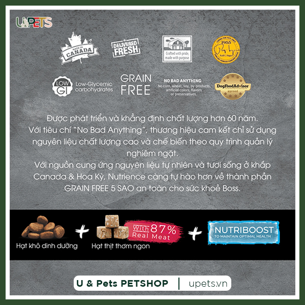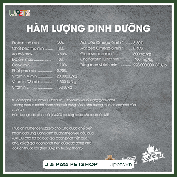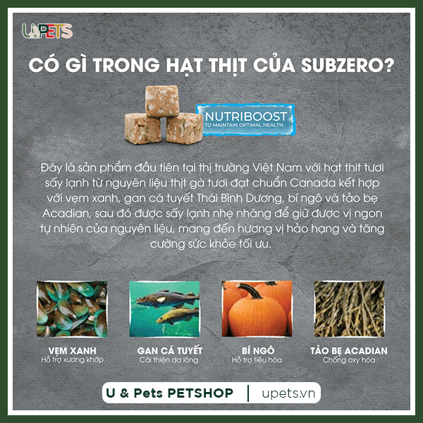 Nutrience Subzero cho Chó được chế biến đảm bảo đáp ứng đầy đủ lượng dinh dưỡng theo yêu cầu của AAFCO cho tất cả các giai đoạn phát triển, kể cả cho các dòng chó có kích thước lớn (trên 30kg khi trưởng thành). Cho bạn niềm tin rằng thú cưng của bạn sẽ nhận được chế độ ăn dinh dưỡng và thơm ngon nhất từ những thành phần tự nhiên và tươi sống của Canada.