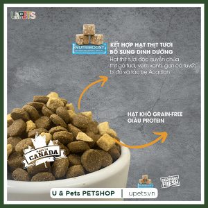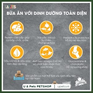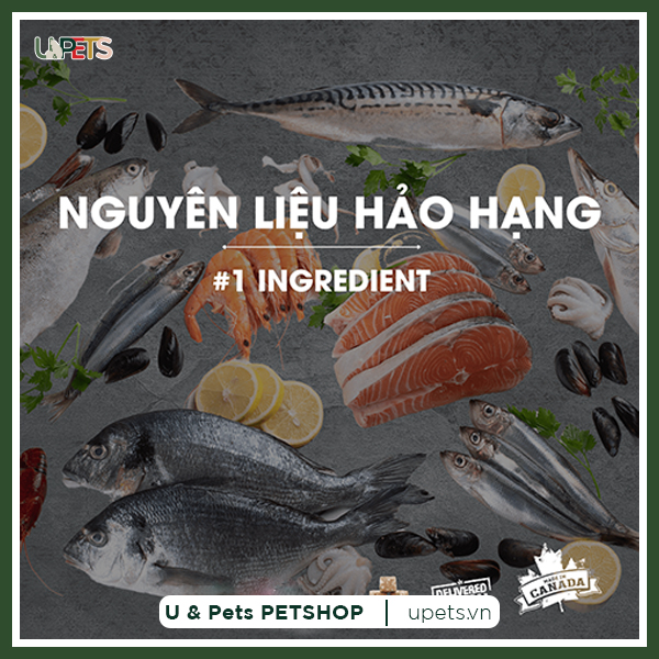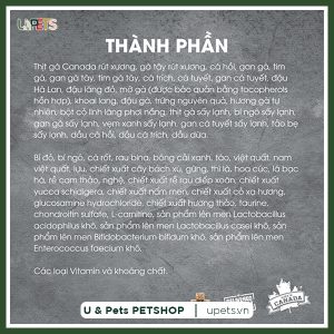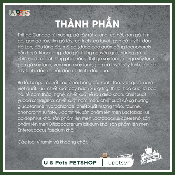 Thành Phần Chính: Thịt gà Canada rút xương, gà tây rút xương, cá hồi, gan gà, tim gà, gan gà tây, tim gà tây, cá trích, cá tuyết, gan cá tuyết, đậu Hà Lan, đậu lăng đỏ, mỡ gà, khoai lang, đậu gà, trứng nguyên quả, hương gà tự nhiên, bột cỏ linh lăng phơi nắng, thịt gà sấy lạnh, bí ngô sấy lạnh, gan gà sấy lạnh, vẹm xanh sấy lạnh, gan cá tuyết sấy lạnh, tảo bẹ sấy lạnh, dầu cá hồi, dầu cá trích, dầu dừa.